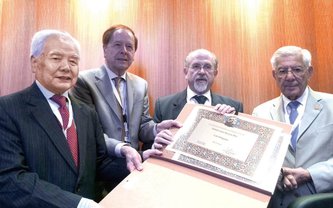 国际社会防卫学会2015年4月15日在多哈授予高铭暄“ 切萨雷·贝卡里亚奖”证书。该奖项素有刑法学的“ 诺贝尔奖”之称,高铭暄是首位获此殊荣的亚洲人。( 图/傅跃建)